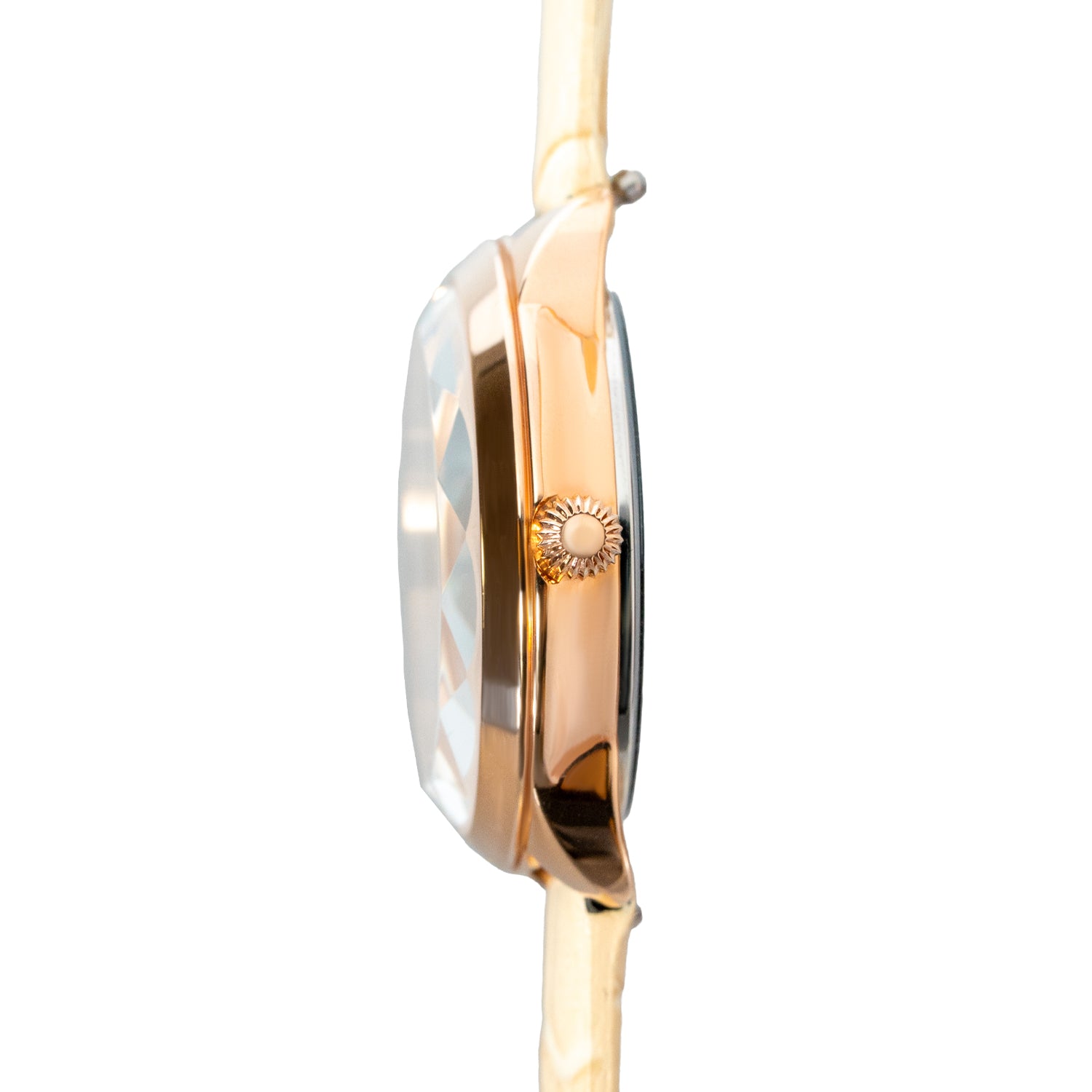 文字盤全体に贅沢なマザーオブパールをあしらい、自然が生み出す唯一無二の輝きと色彩をお楽しみいただけます。